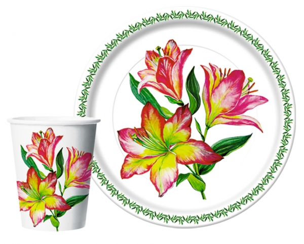 Комплект одноразовой посуды и салфеток Лилии. Тарелки картонные Набор одноразовой посуды Совы230мм-10шт, Стаканы бумажные 250мл-10шт,Салфетки 3-х слойные 33*33 20шт/уп.